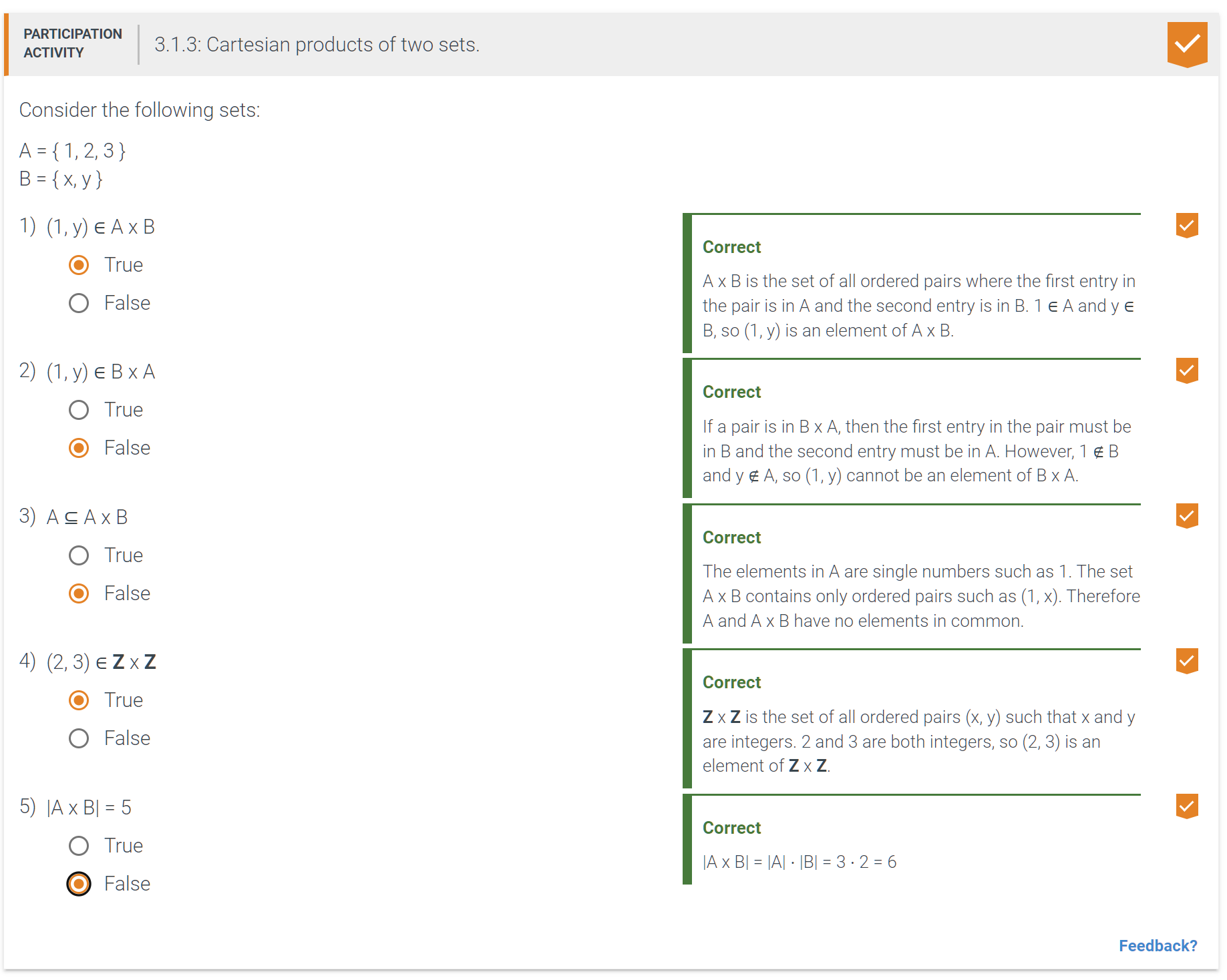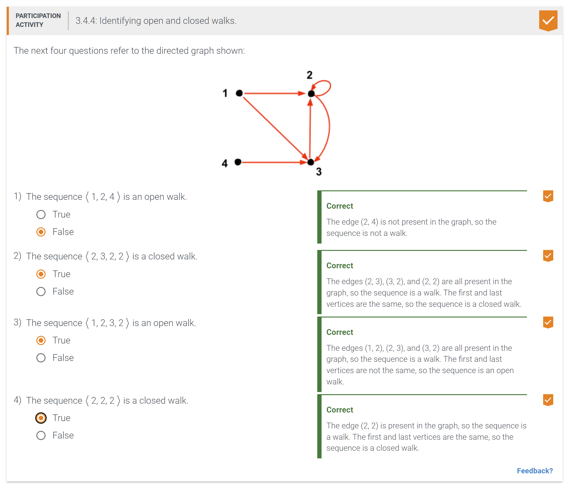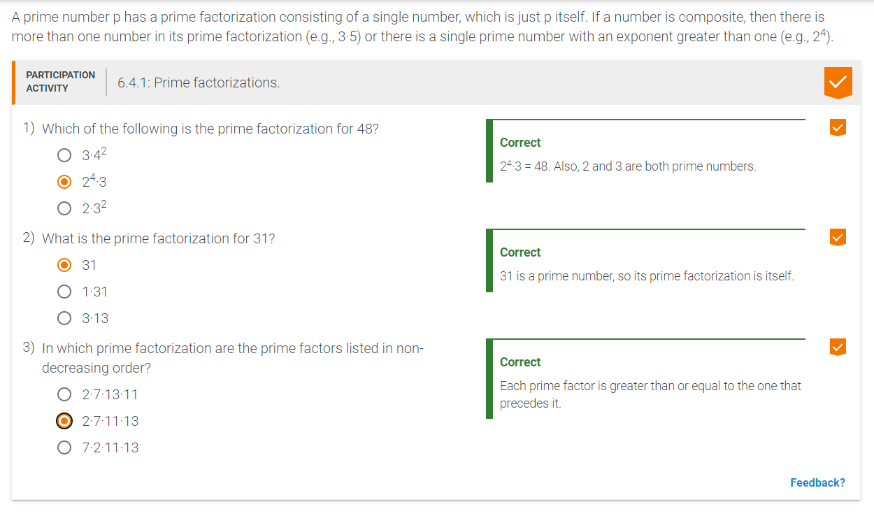 My Discrete Math course assignments were all presented through an online textbook, using Zybooks. We also took three tests, all of them proctored by MonitorEDU. I've included various screenshots of notes and assignments to show an example of what topics were covered.